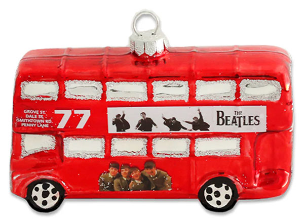 From Kat & Annie For 2024 Season - Get ready to amplify your holiday spirit with this Beatles 'A Hard Day's Night' Bus ornament! Drenched in vibrant red, this stylish piece will bring a touch of fabulous fun to your tree. All aboard for a rockin' Christmas! measures approximately 4" x 1.25" x 2.75"